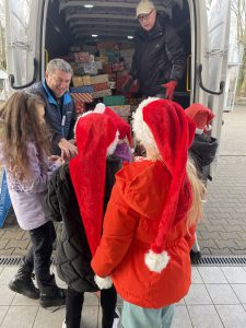 Links: Die Kinder der Klasse 3a bringen die Geschenke in den Transporter. Rechts: Herr Iffland & die „Weihnachtsmänner“ der Kinderzukunft.