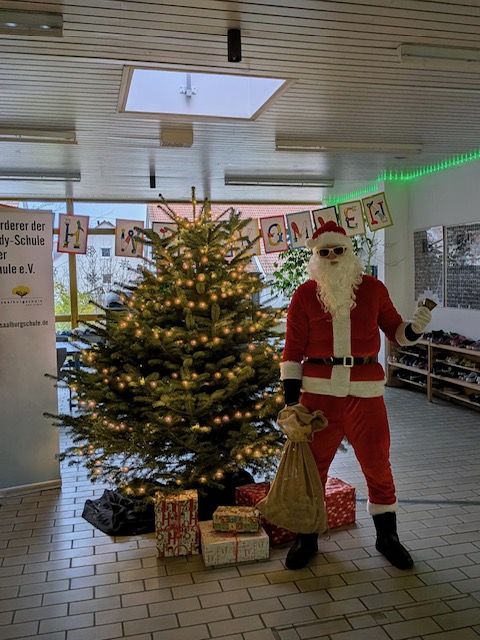 Am 6. Dezember hörten alle Kinder der Schule einen schweren Schritt im Schulflur, bevor es dann auch schon an der Klassenzimmertür polterte und der Nikolaus eintrat. Dieser hatte sich mit Sonnenbrille und schwerem Sack auf den Weg gemacht, all unsere Schülerinnen- und Schüler mit einem kleinen Schokoladengeschenk zu versehen. Selbst in der Schulpause ließ er sich blicken und wurde dort von den Kindern gebührend gefeiert.
